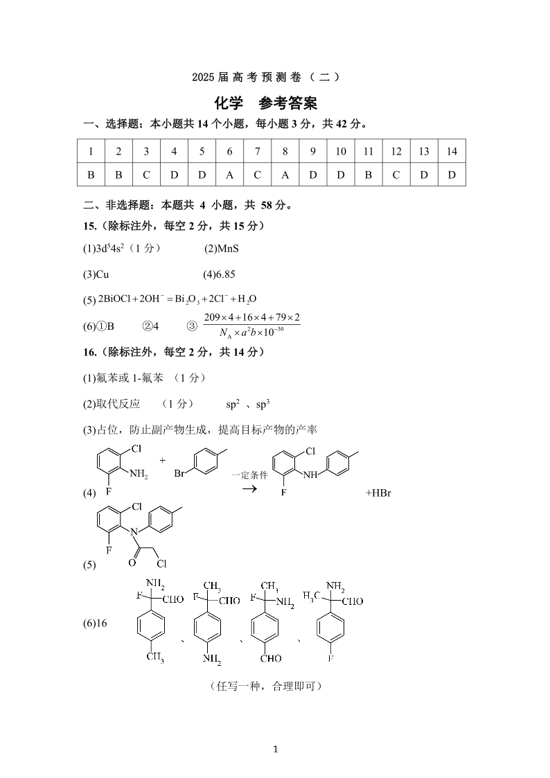 陕西省三重教育2024-2025学年下学期高考预测卷(二)化学答案