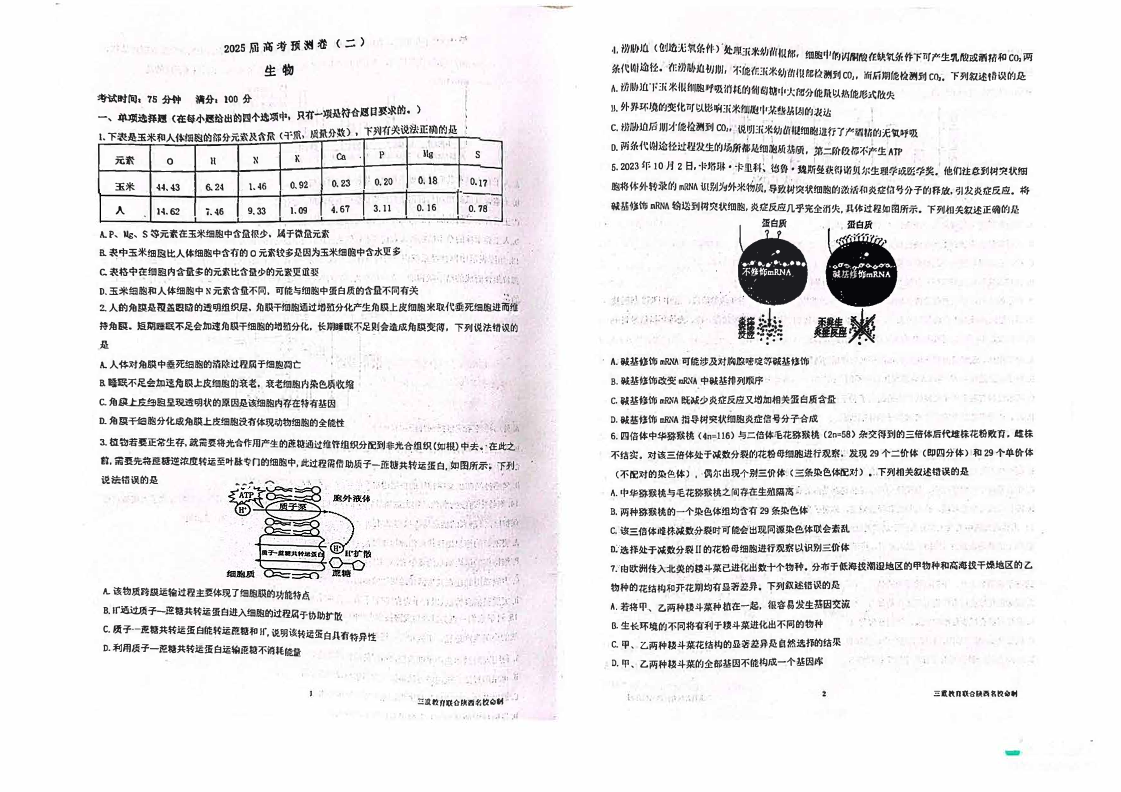 陕西省三重教育2024-2025学年下学期高考预测卷(二)生物+答案