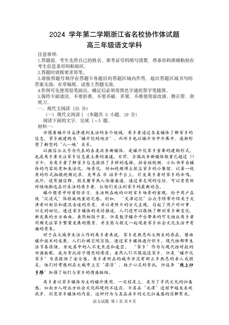 浙江省G12名校协作体2024-2025学年下学期2月高三返校联考语文