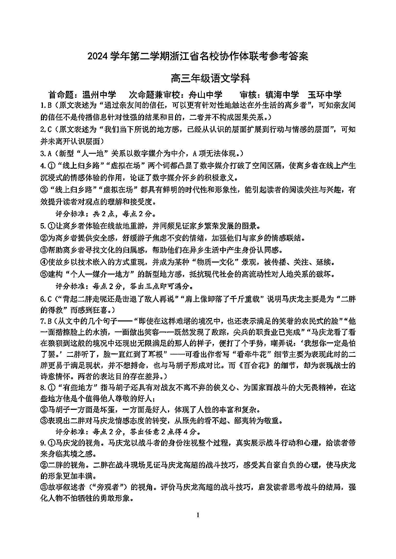 浙江省G12名校协作体2024-2025学年下学期2月高三返校联考语文答案