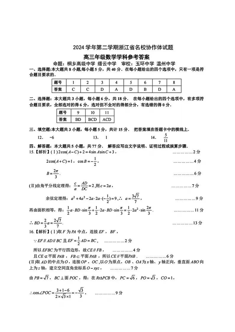浙江省G12名校协作体2024-2025学年下学期2月高三返校联考数学答案