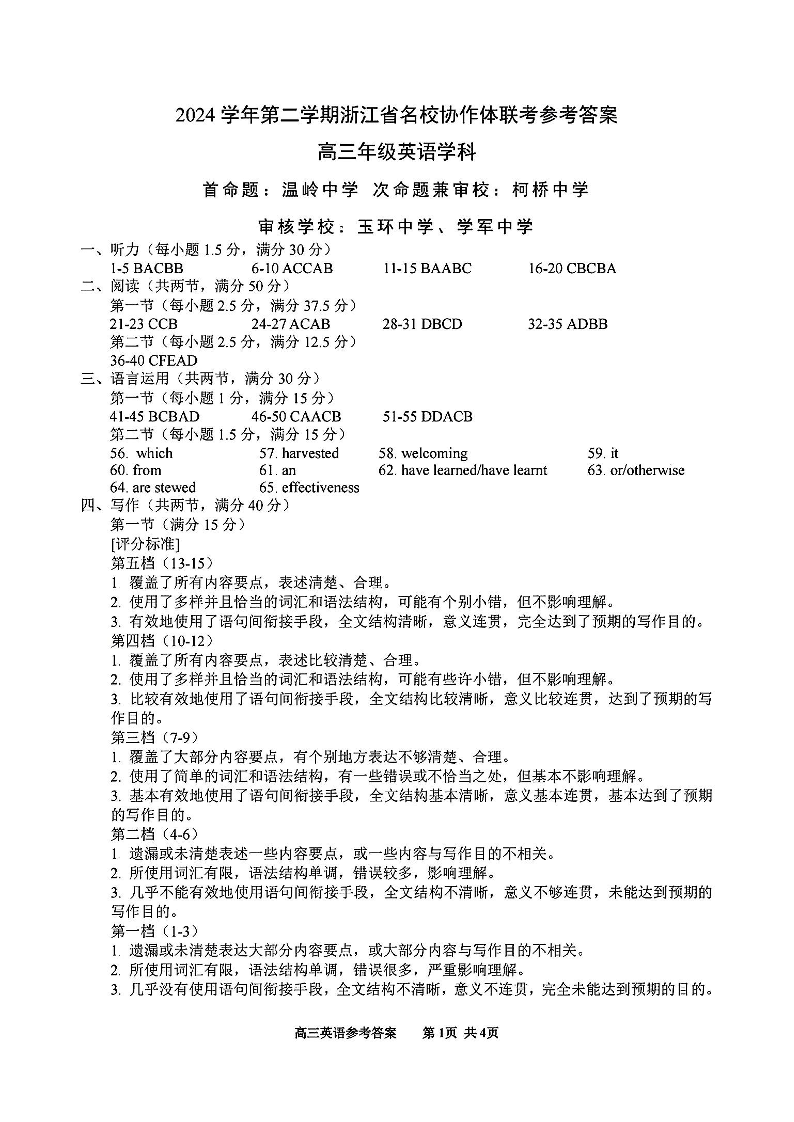 浙江省G12名校协作体2024-2025学年下学期2月高三返校联考英语答案