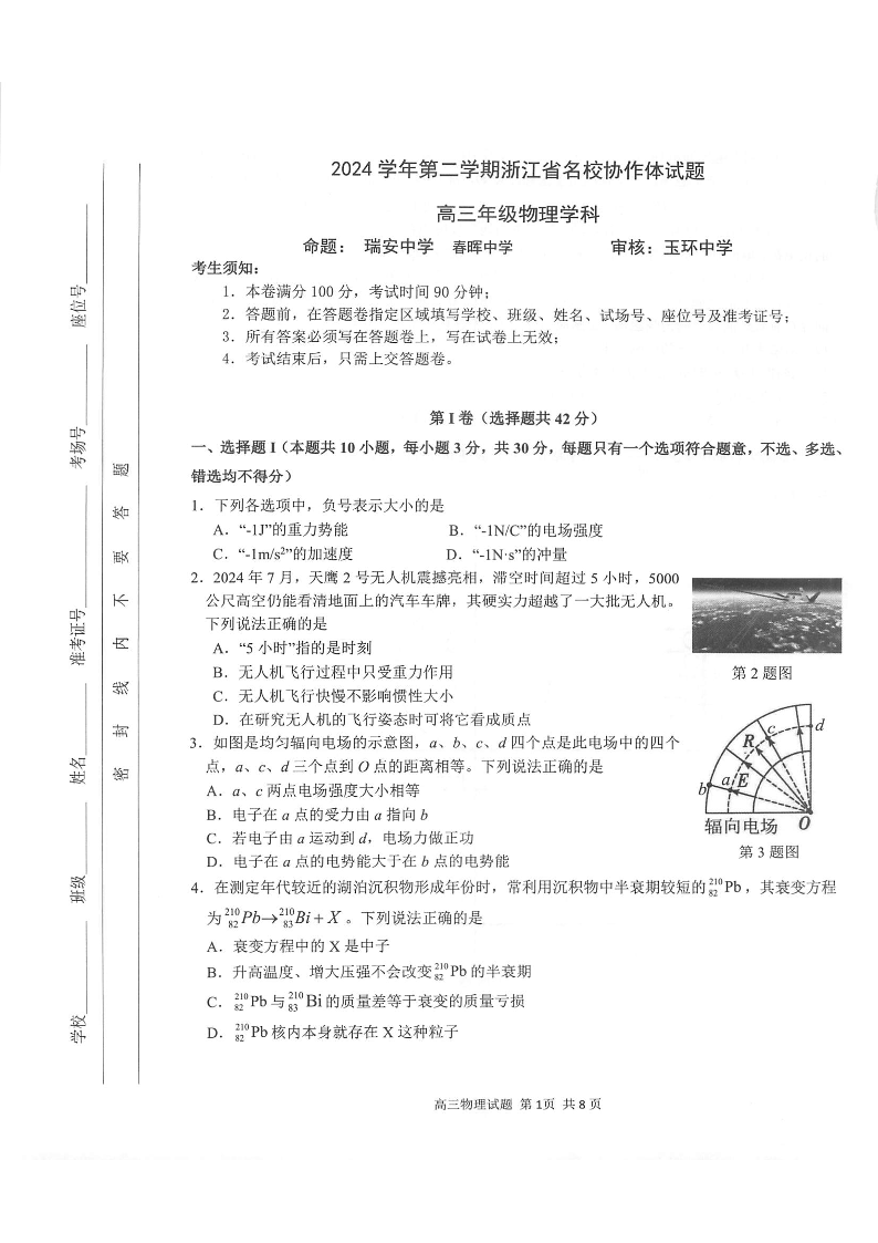 浙江省G12名校协作体2024-2025学年下学期2月高三返校联考物理