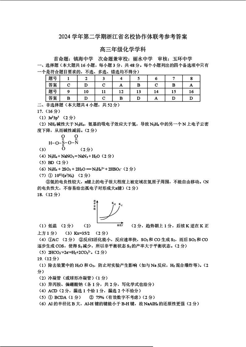 浙江省G12名校协作体2024-2025学年下学期2月高三返校联考化学答案