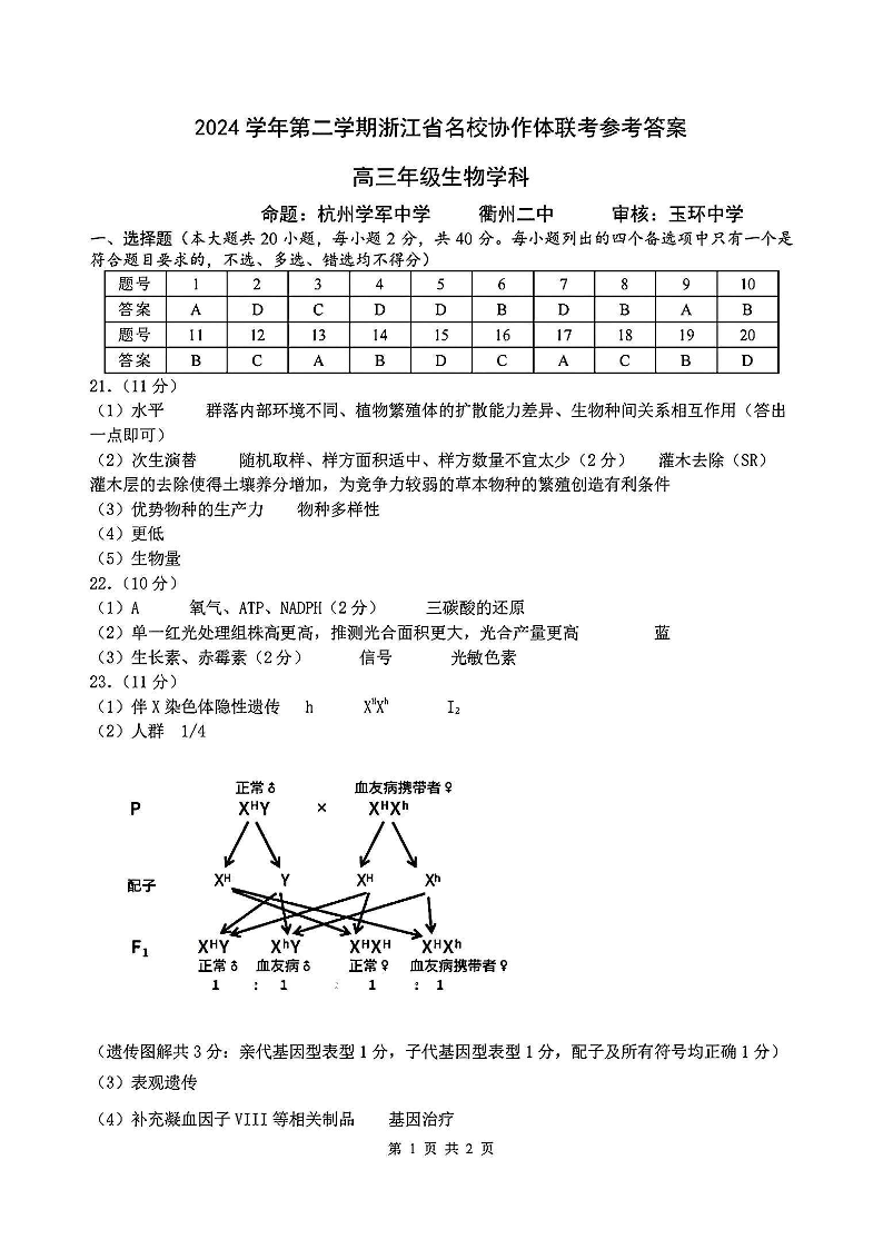 浙江省G12名校协作体2024-2025学年下学期2月高三返校联考生物答案
