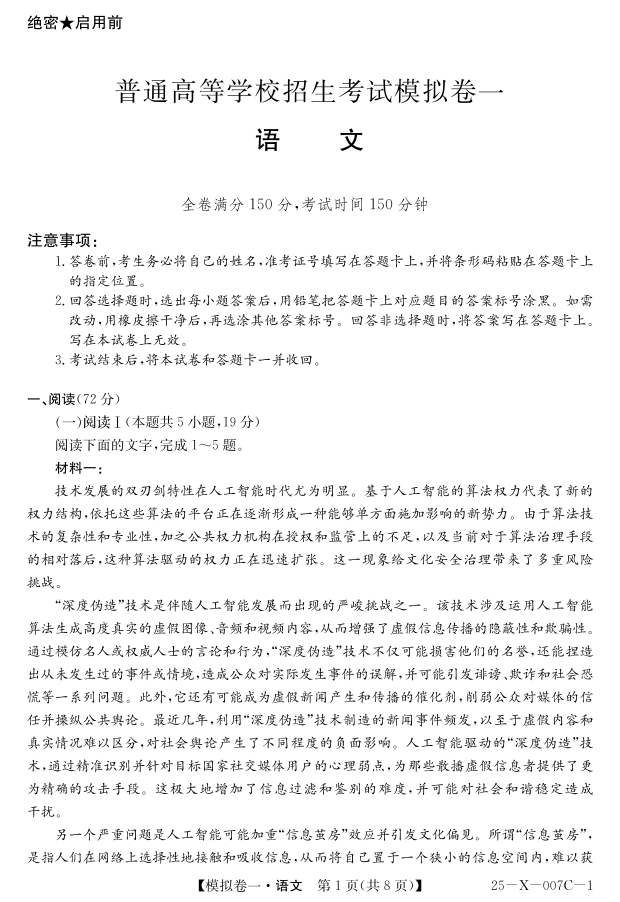 河南省新高中创新联盟2024-2025学年下学期高三模拟卷一语文