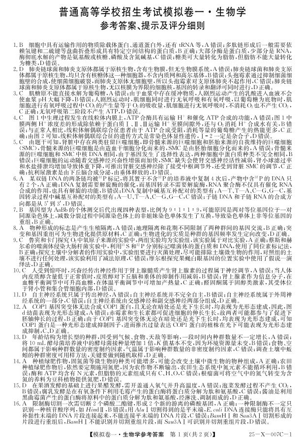 河南省新高中创新联盟2024-2025学年下学期高三模拟卷一生物答案