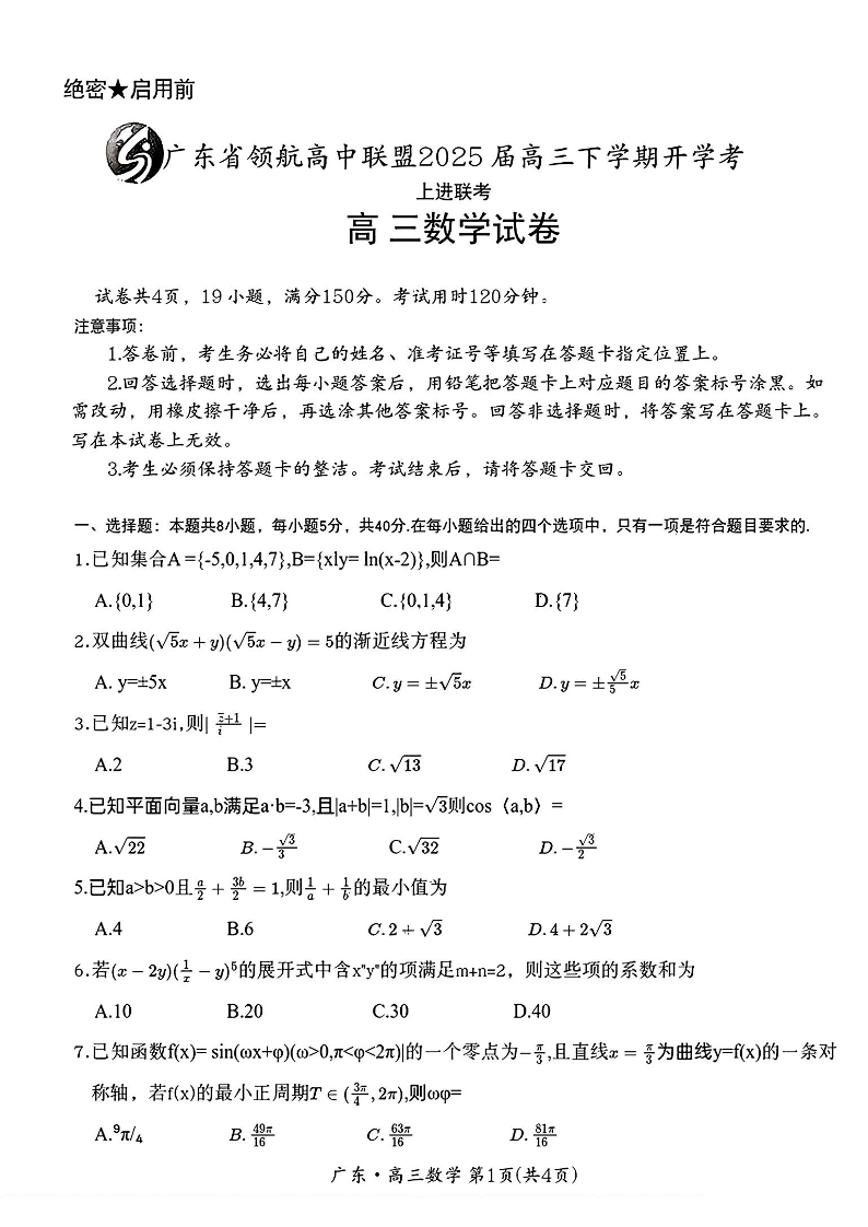广东省领航高中联盟2024-2025学年下学期2月高三开学考数学+答案