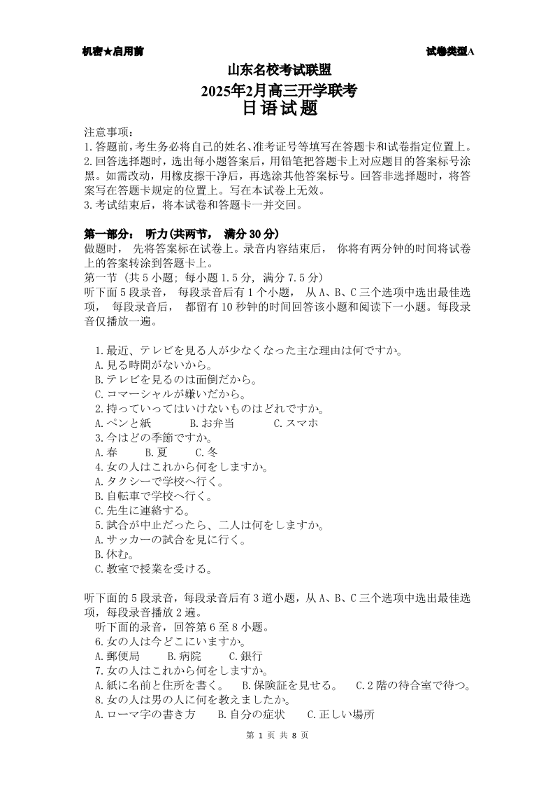 山东省济南名校考试联盟2025年2月高三开学联考日语