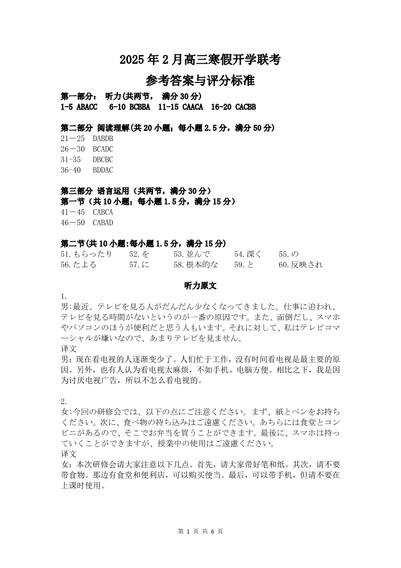山东省济南名校考试联盟2025年2月高三开学联考日语答案
