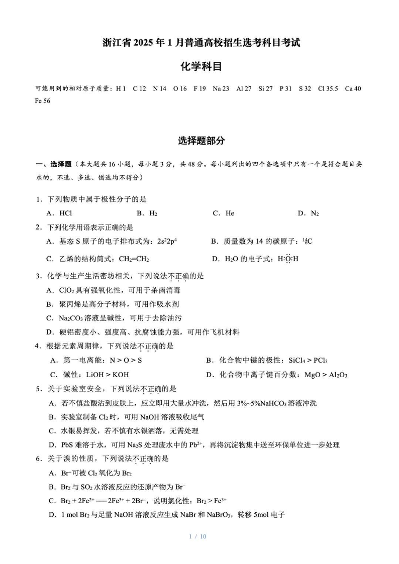 2025年1月浙江省普通高等学校招生选考科目考试化学+答案