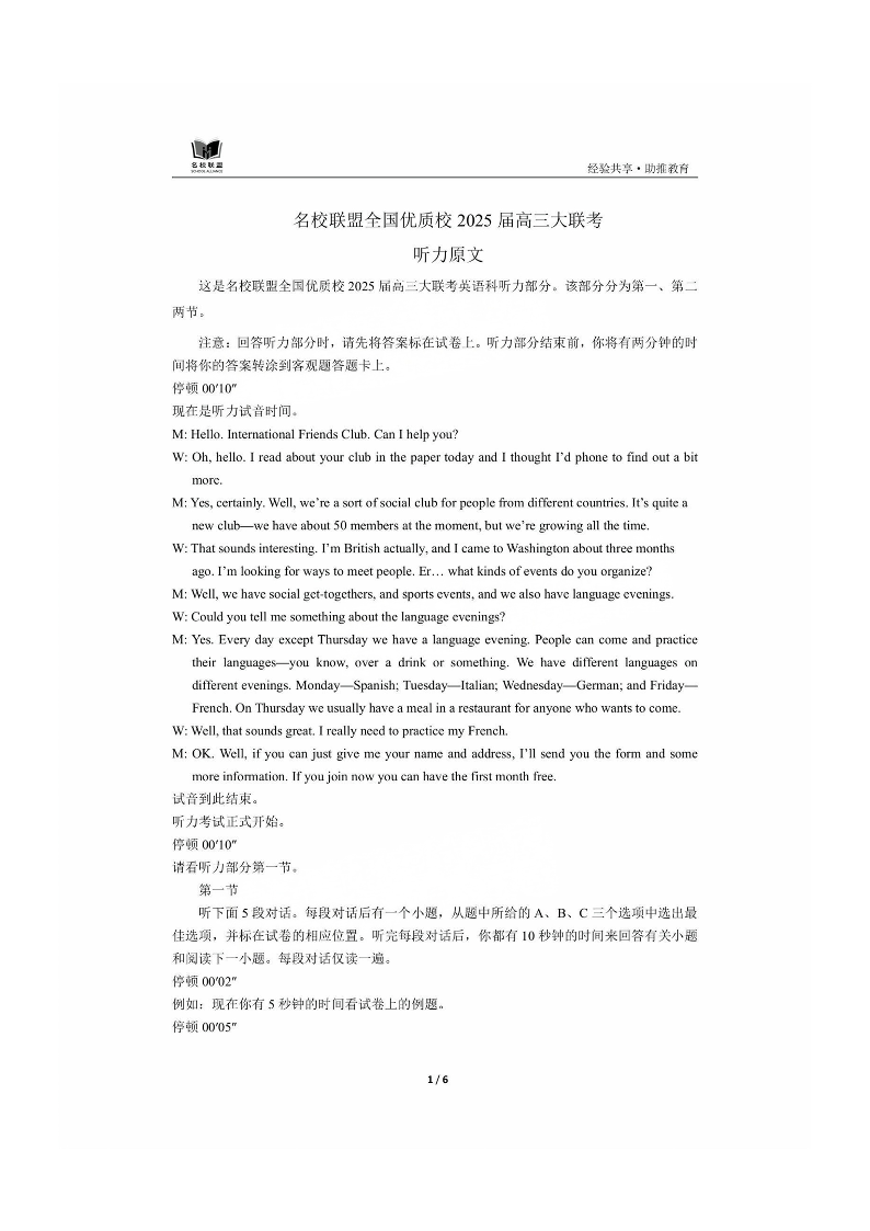 福建省名校联盟优质校2024-2025学年下学期2月高三联考英语答案