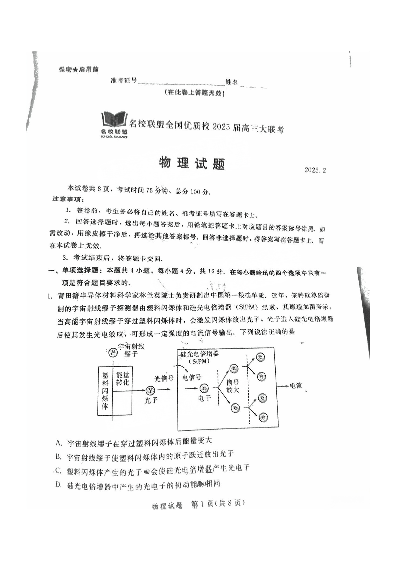 福建省名校联盟优质校2024-2025学年下学期2月高三联考物理