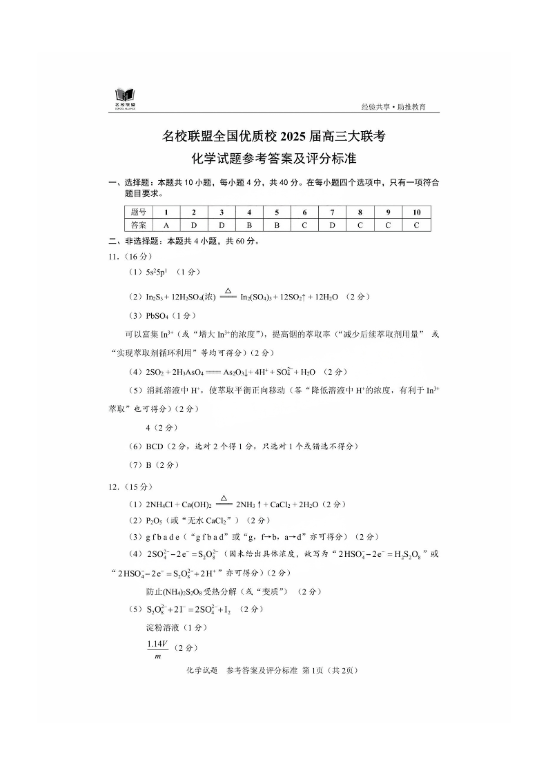 福建省名校联盟优质校2024-2025学年下学期2月高三联考化学答案