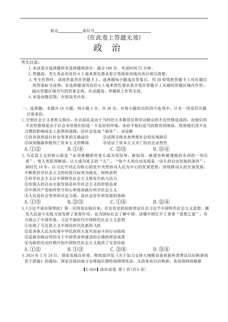江西省九江市十校联考2024-2025学年下学期2月高三月考政治