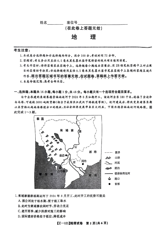 江西省九江市十校联考2024-2025学年下学期2月高三月考地理+答案