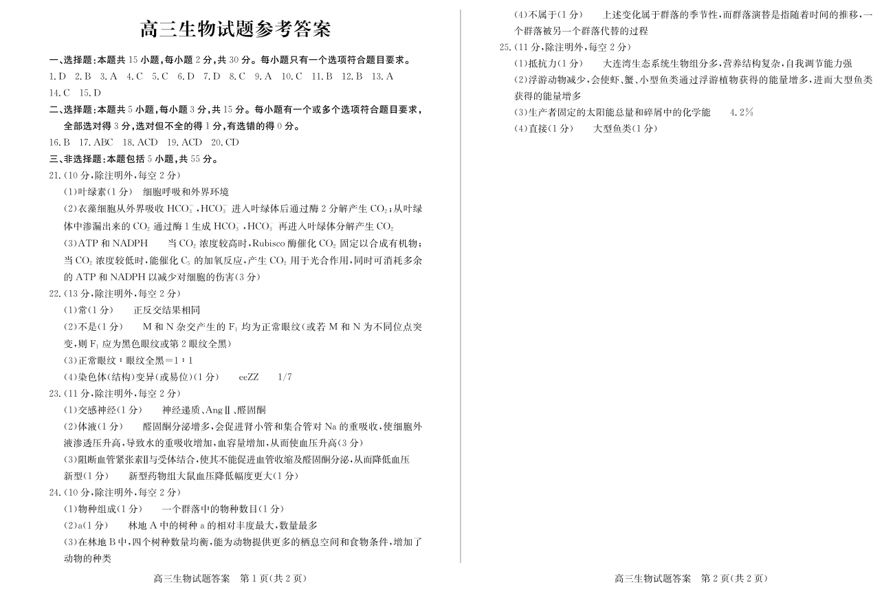 山东省德州市2024-2025学年高三下学期开学考试生物答案