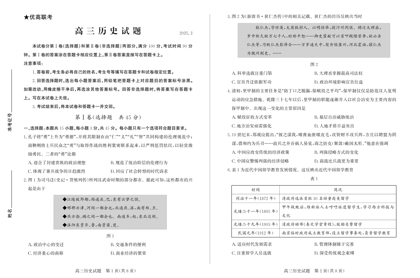 山东省德州市2024-2025学年高三下学期开学考试历史