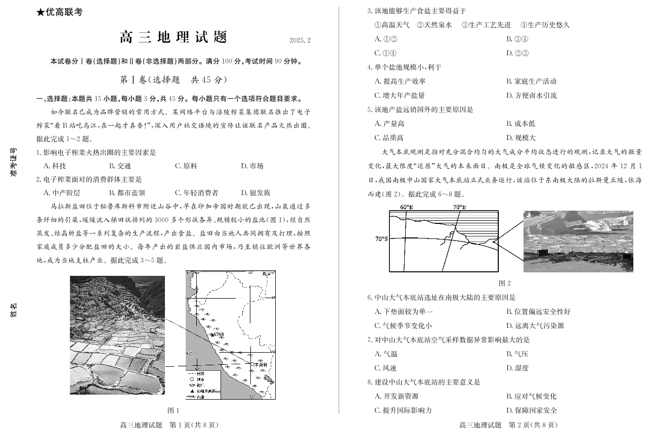 山东省德州市2024-2025学年高三下学期开学考试地理试题