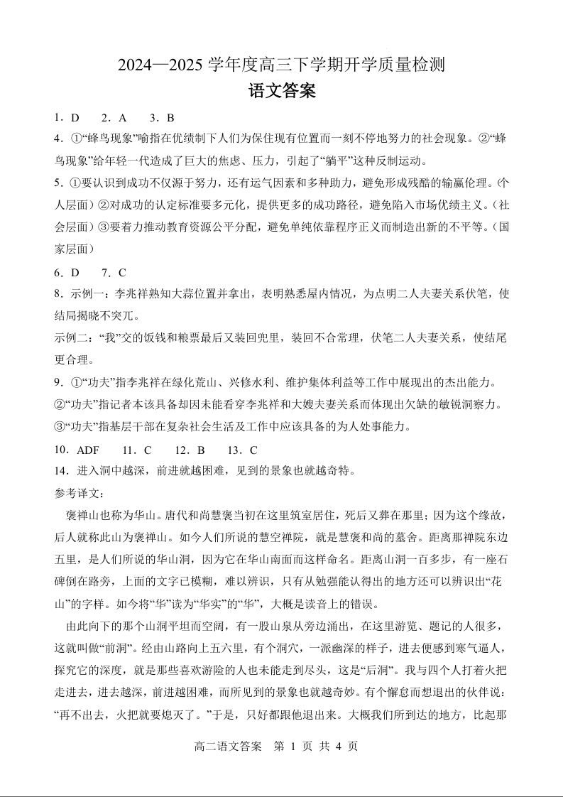 山东省淄博实验中学2024-2025学年下学期高三开学考试语文答案