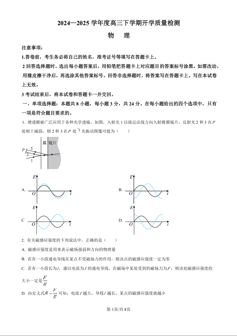 山东省淄博实验中学2024-2025学年下学期高三开学考试物理(原卷版)
