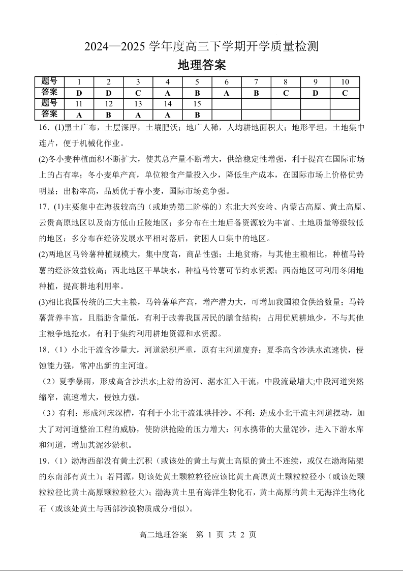 山东省淄博实验中学2024-2025学年下学期高三开学考试地理答案