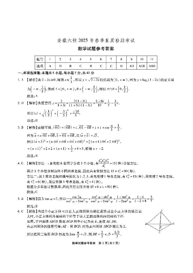 安徽省六校2024-2025学年下学期2月高三素质检测考试数学答案