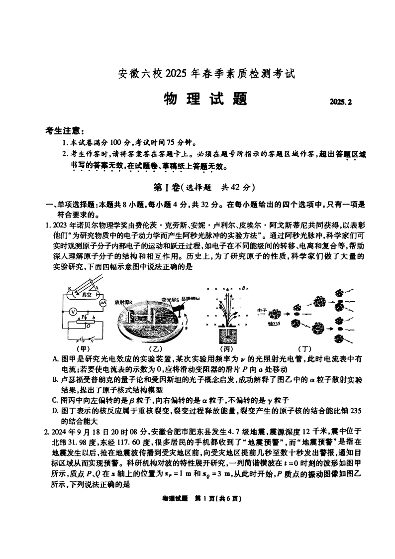 安徽省六校2024-2025学年下学期2月高三素质检测考试物理