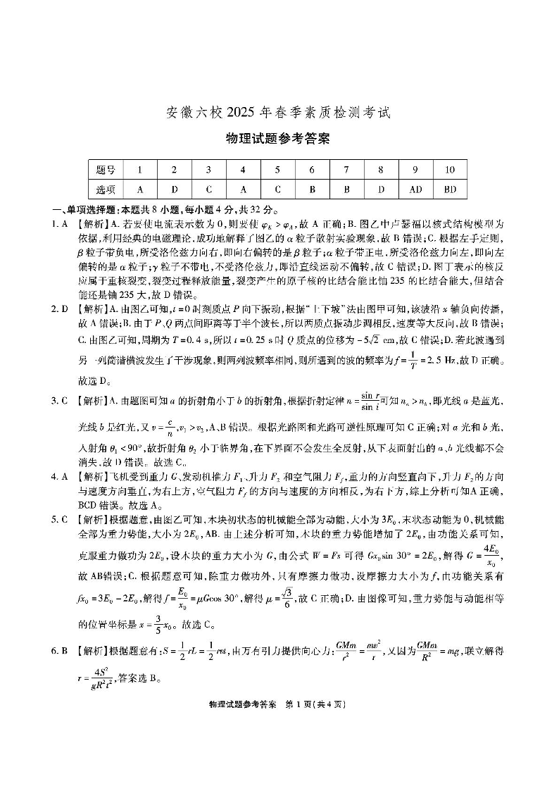 安徽省六校2024-2025学年下学期2月高三素质检测考试物理答案