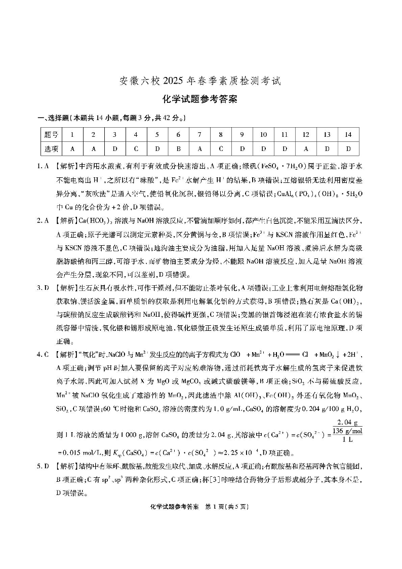 安徽省六校2024-2025学年下学期2月高三素质检测考试化学答案
