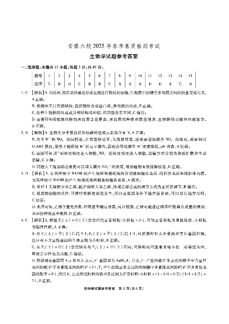 安徽省六校2024-2025学年下学期2月高三素质检测考试生物答案