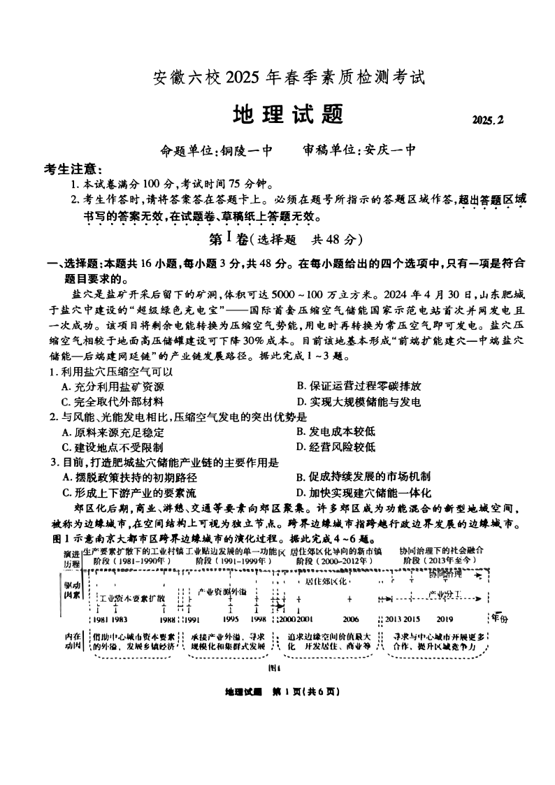 安徽省六校2024-2025学年下学期2月高三素质检测考试地理