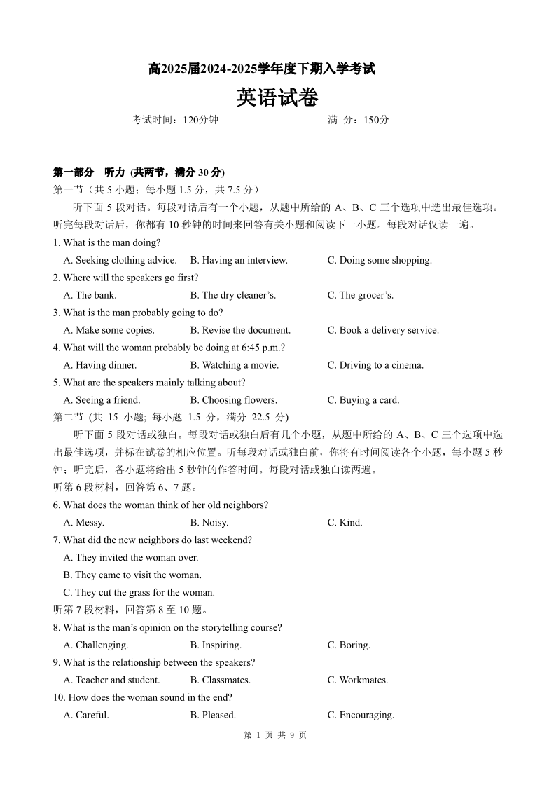 四川省成都市第七中学2024-2025学年高三下学期2月入学考试英语