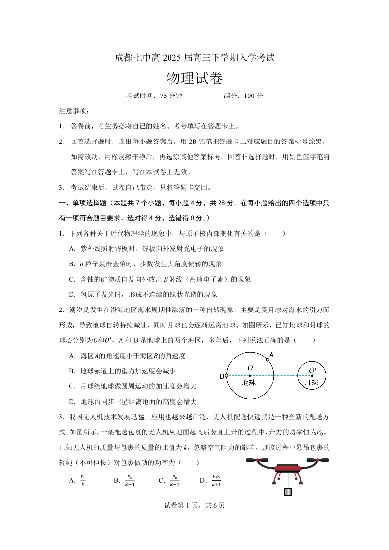 四川省成都市第七中学2024-2025学年高三下学期2月入学考试物理