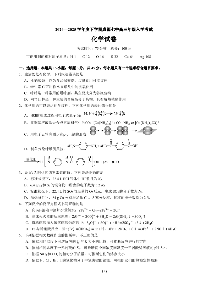 四川省成都市第七中学2024-2025学年下学期2月高三入学考试化学