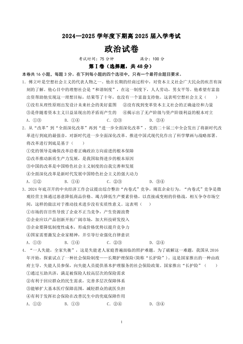四川省成都市第七中学2024-2025学年高三下学期2月入学考试政治