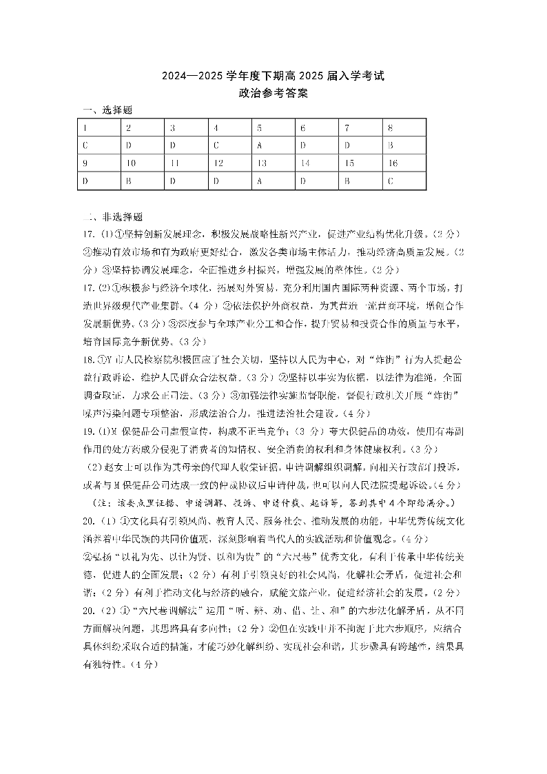 四川省成都市第七中学2024-2025学年高三下学期2月入学考试政治答案