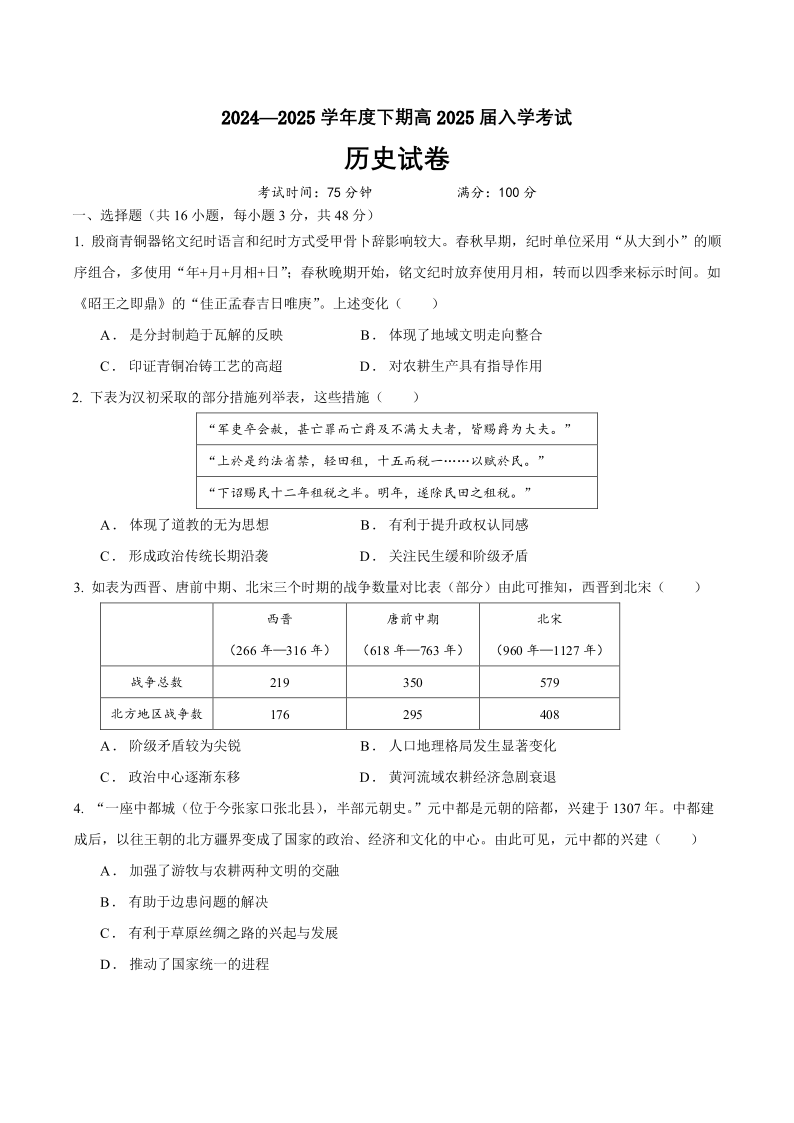 四川省成都市第七中学2024-2025学年高三下学期2月入学考试历史