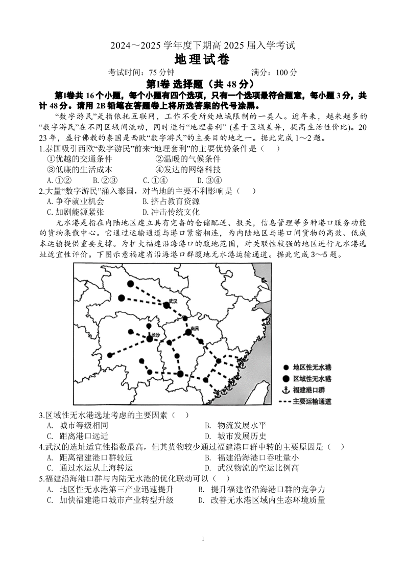 四川省成都市第七中学2024-2025学年高三下学期2月入学考试地理