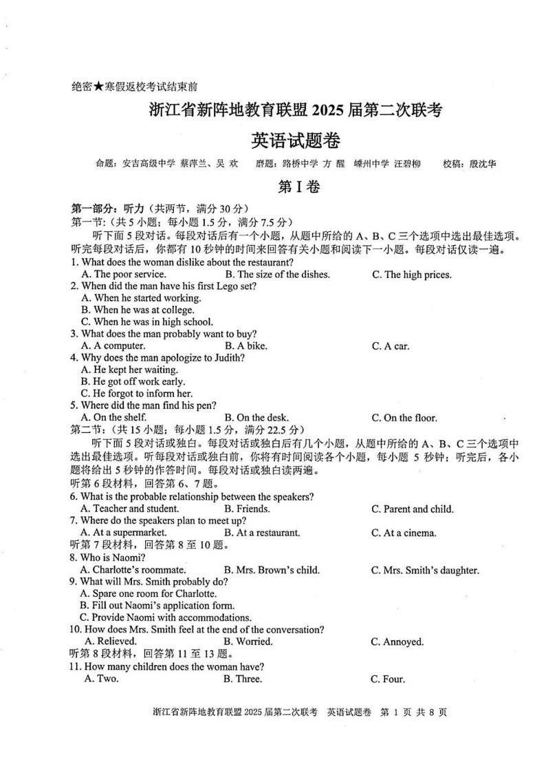 浙江省新阵地教育联盟2024-2025学年下学期高三第二次联考英语+答案