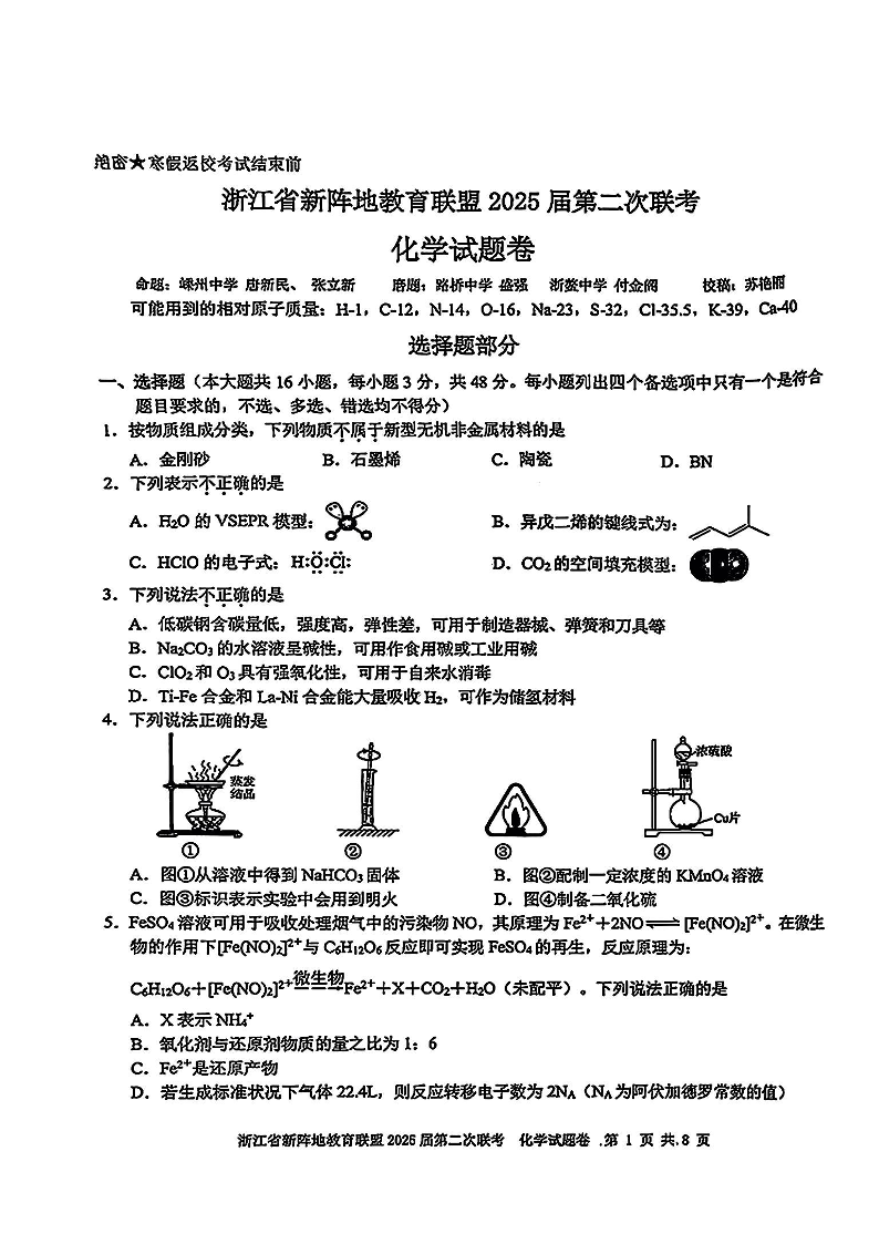 浙江省新阵地教育联盟2024-2025学年下学期高三第二次联考化学+答案