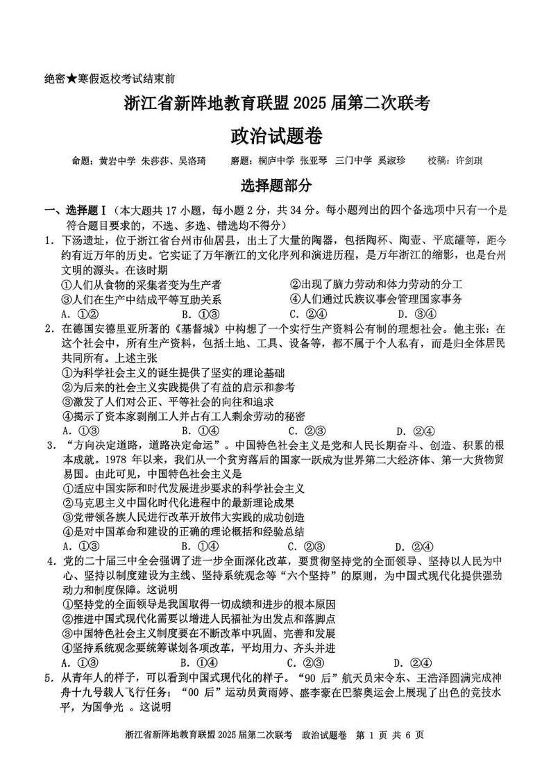 浙江省新阵地教育联盟2024-2025学年下学期高三第二次联考政治+答案