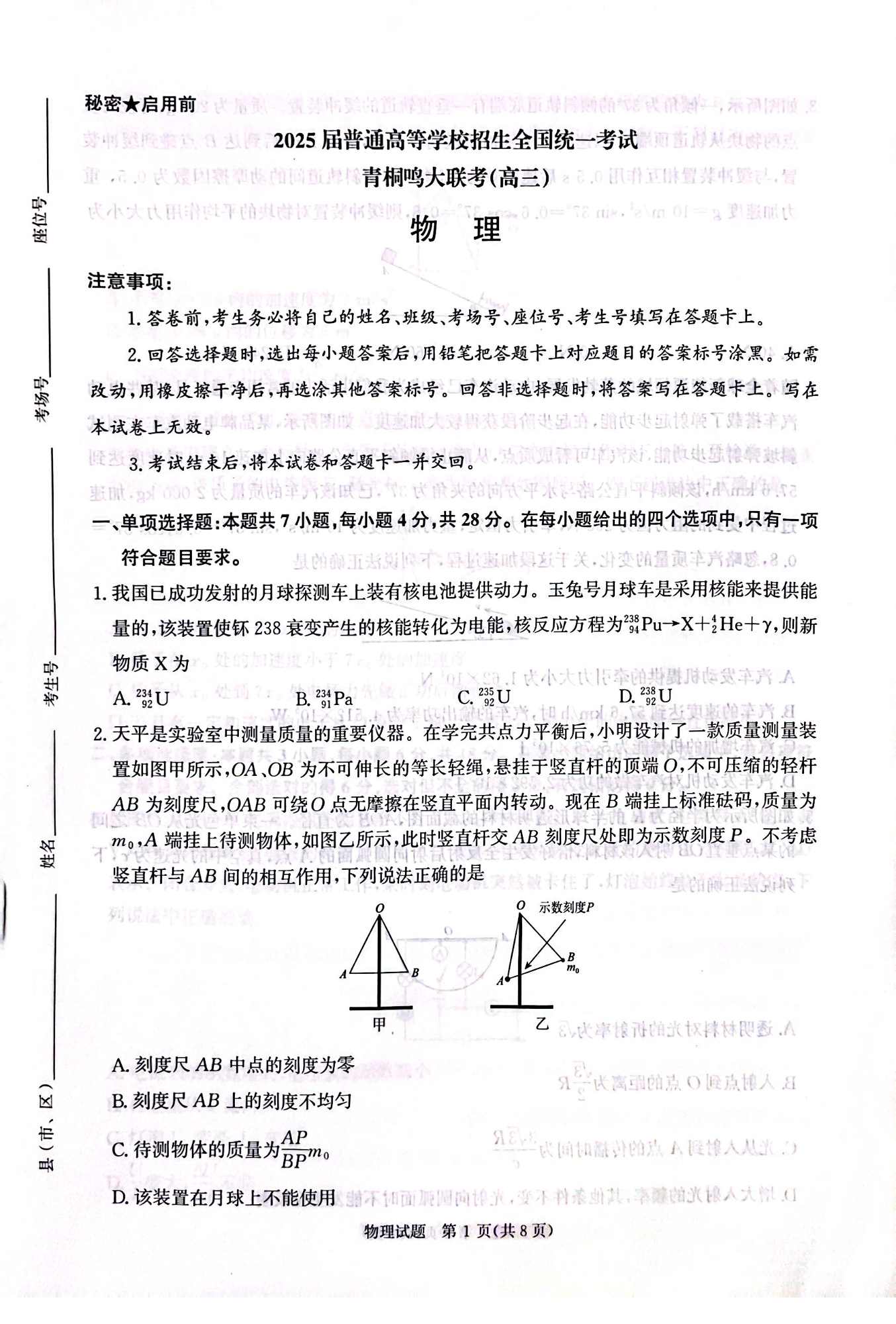 河南省部分高中2024-2025学年下学期2月高三联考物理