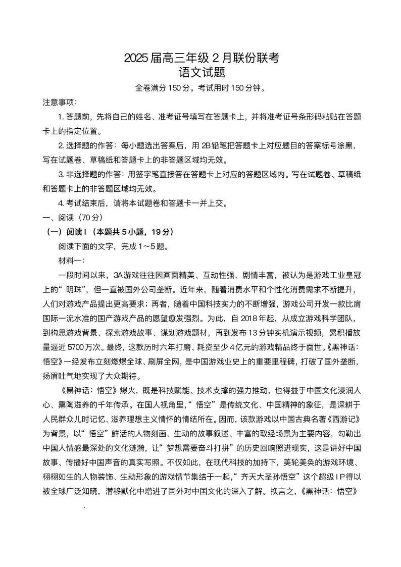 广东省区域高中2024-2025学年下学期高三2月高三联考语文+答案