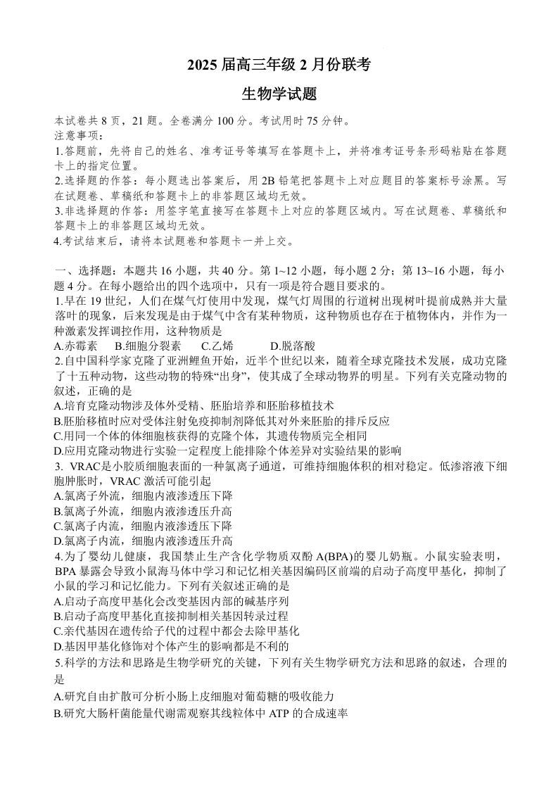 广东省区域高中2024-2025学年下学期高三2月高三联考生物
