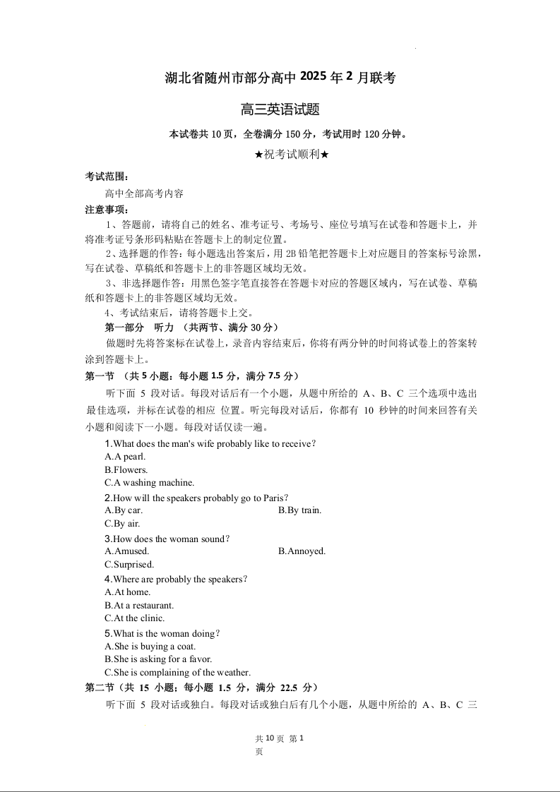 湖北省随州市区域2024-2025学年下学期2月高三月考英语