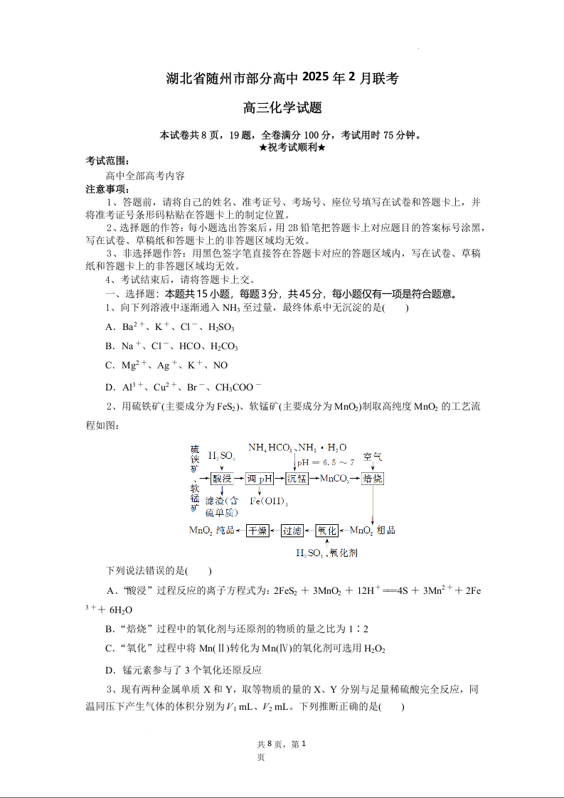 湖北省随州市区域2024-2025学年下学期2月高三月考化学