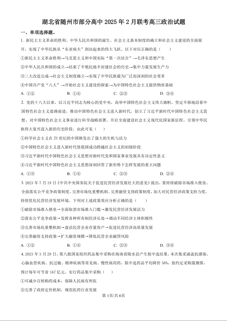 湖北省随州市区域2024-2025学年下学期2月高三月考政治(原卷版)