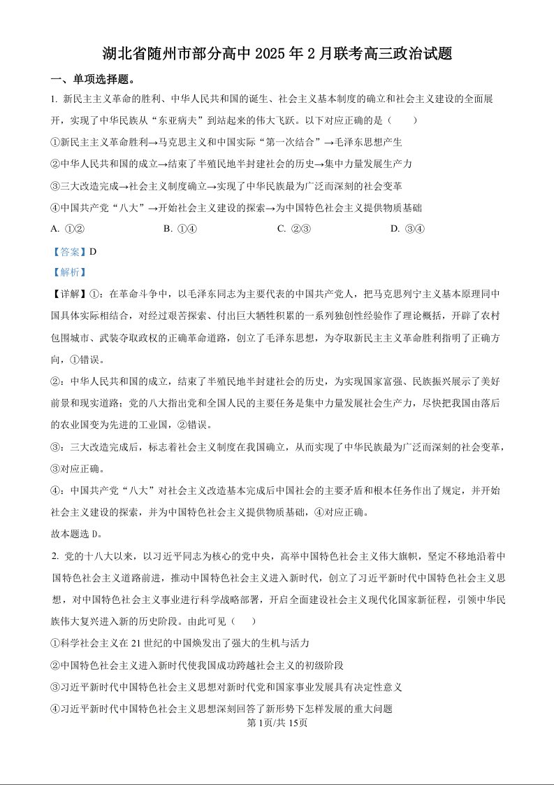 湖北省随州市区域2024-2025学年下学期2月高三月考政治(精品解析版)