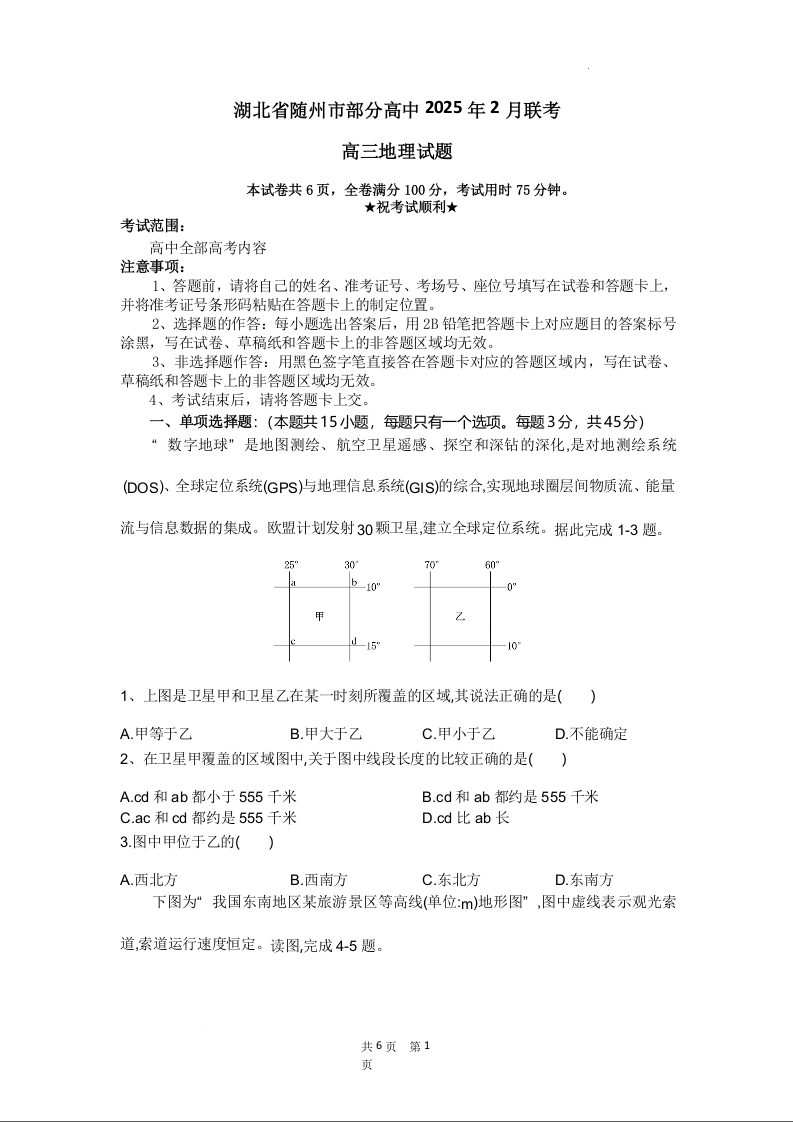 湖北省随州市区域2024-2025学年下学期2月高三月考地理